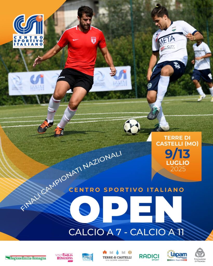 Anche nel calcio a 11 la formula di gioco è la medesima, con 7 squadre che hanno strappato un pass per la finale dei Campionati Nazionali Open CSI. Nel girone A, sono quattro gli “undici” impegnati. Si comincia lo stesso giovedì 10 luglio in contemporanea alle 18:30 sui campi di Marano e Spilamberto, dove si affronteranno nell’ordine i campani dell’Ass. S. Gaetano Pianesi del Comitato di Cava de’ Tirreni, opposti al debutto ai teramani del Pagliare, alla loro seconda partecipazione, gli abruzzesi del basso Vomano (Roseto-Morro d’Oro) mentre sull’altro campo i torinesi dell’Atletico Moncalieri del Comitato Subalpino se la vedranno in partenza con i sardi del 100% Super Depor Sassari. La finale Open di calcio a 11 è in programma domenica 13 luglio alle ore 9 al Castelvetro (MO). Per arrivarci serviranno le due gare di semifinali incrociate contro le prime due del girone B, dove giocheranno a Vignola, Marano e Savignano, i veronesi del Cerea, i novaresi San Maurizio Calcio, prime due squadre a scendere in campo oltre ai padroni di casa emiliani ossia i reggiani della Pol. Scandianese.