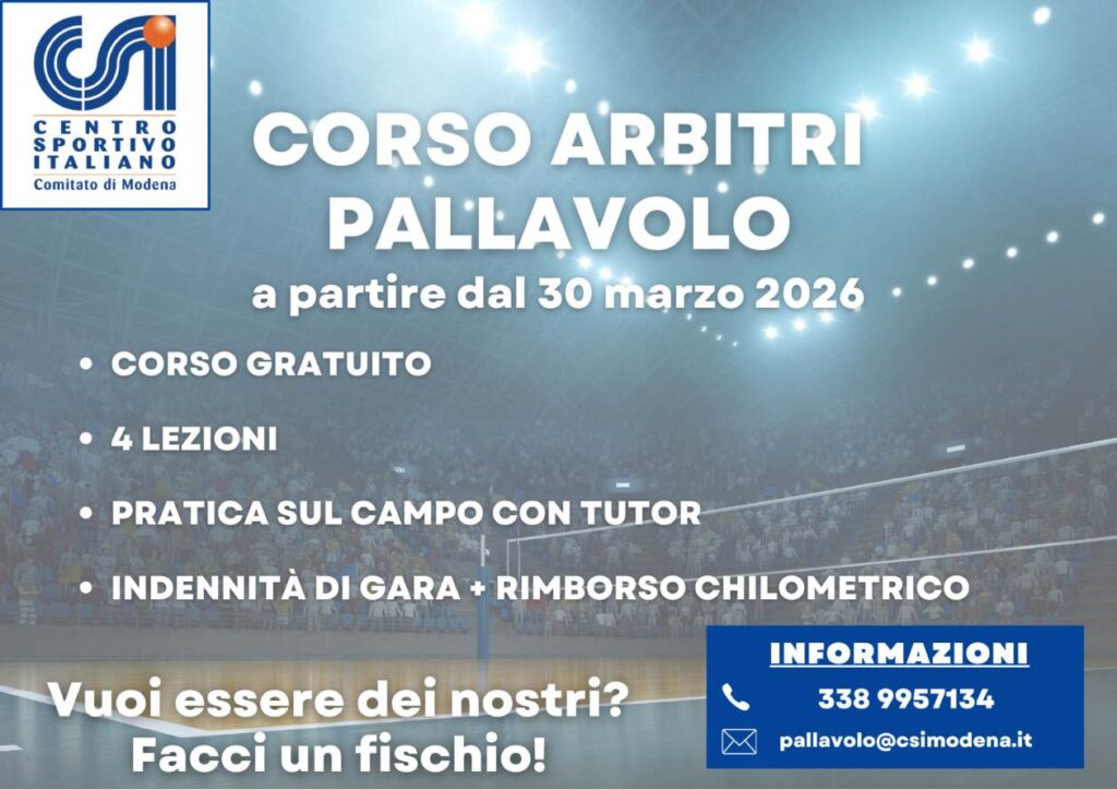 Al termine del corso, chi supererà l’esame, sarà inserito nel Gruppo Arbitri Pallavolo del Csi di Modena, riceverà gratuitamente la divisa arbitrale e sarà designato.