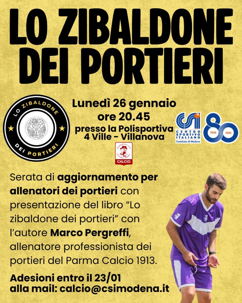 Lunedì 26 gennaio alle 20:45 presso la sala T. Setti della Polisportiva 4 Ville (via Barbolini, 7-9) si terrà una serata di formazione dedicata all’area portieri, un momento di approfondimento tecnico e culturale che vedrà anche la presentazione del libro “Lo Zibaldone dei Portieri” di Marco Pergreffi, allenatore professionista dei portieri del Parma Calcio 1913. L’opera raccoglie riflessioni, esperienze e spunti pratici dedicati a uno dei ruoli più affascinanti e complessi del calcio.
