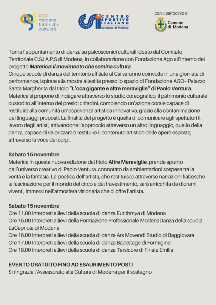 Torna l’appuntamento di danza su palcoscenici culturali ideato dal Comitato Territoriale CSI APS di Modena, in collaborazione con Fondazione Ago all’interno del progetto “Materica: il movimento che semina cultura“. Cinque scuole di danza del territorio affiliate al CSI saranno coinvolte in una giornata di performance, ispirate alla mostra allestita presso lo spazio di Fondazione AGO – Palazzo Santa Margherita dal titolo “L’oca gigante e altre meraviglie” di Paolo Ventura.