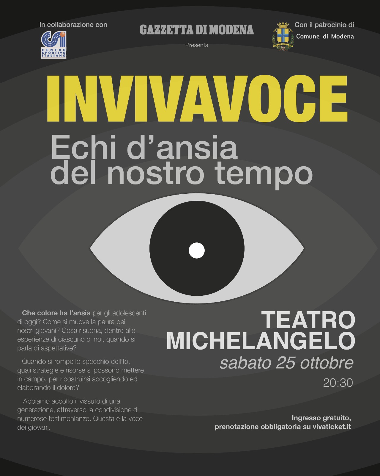 “Invivavoce” è un evento unico nel suo genere, prodotto e ideato dalla Gazzetta di Modena e dal Centro Sportivo Italiano grazie alla collaborazione di un gruppo di lavoro formato da giovani, educatori, artisti, psicologi, formatori, tutti uniti da un unico obiettivo: lasciare che la voce dei giovani non resti inascoltata. La nostra voce è quella dei giovani, che ci hanno chiesto uno spazio, un luogo dove potersi fare ascoltare. Li abbiamo uniti, ci siamo uniti a loro, e abbiamo scelto diverse forme d’arte per raccontare quello che sentivano. Per questo l’evento di sabato 25 ottobre al Michelangelo toccherà diverse corde. Emozionerà, ne siamo certi. Perché c’è tanta realtà dentro a “Invivavoce”, quella realtà che ci circonda e che spesso resta inascoltata, sottotraccia. Abbiamo provato a portarla sul palco per vedere quanto è vicina a noi e quanto ancora ci sia bisogno di fare per testimoniare. E’ la seconda edizione di Invivavoce: sei repliche in totale – di cui quattro dedicate solo agli studenti – e due tematiche che appartengono tanto, tantissimo alla nostra attualità. Nel 2024 la violenza di genere e quest’anno l’ansia. Tutto rientra in una più ampia riflessione dedicata ai giovani: l’esigenza di questa iniziativa nasce dal confronto con alcuni studenti di Modena, protagonisti dei progetti scolastici di Gazzetta di Modena e Csi, che hanno chiesto di interrogarci in maniera differente rispetto ai temi di attualità. Attraverso le diverse arti della scena quali la musica, la danza, il teatro e la narrazione di storie vere, nasce da una necessità di ascolto e arriva a toccare un messaggio di speranza.